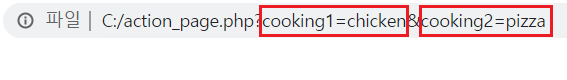 치킨과 피자의 checkbox를 전부 체크한 후 Submit 버튼을 누른 후 url을 살펴보면 다음과 같이 "?" 다음에 input태그의 "name값=value값" 이 들어가는 것을 확인 할 수 있습니다.